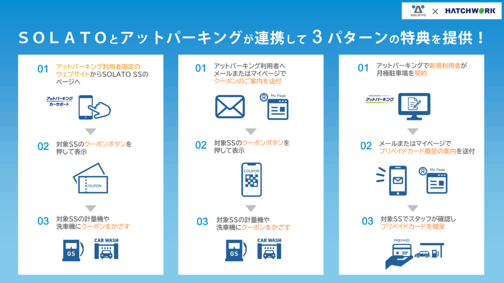太陽石油とハッチ・ワークは、これらの課題解決と新たな顧客体験の提供を目指し、SOLATO SSと月極駐車場における相互送客のキャンペーンを行うことになりました。