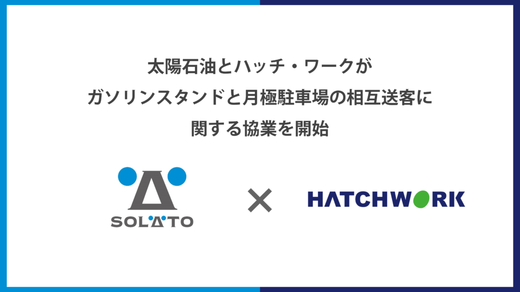 株式会社ハッチ・ワーク(本社:東京都港区、代表取締役社長:増田知平、以下「ハッチ・ワーク」)は、太陽石油株式会社(本社:東京都千代田区、代表取締役社長:山本堯大、以下「太陽石油」)と協業し、SOLATO サービスステーション(以下「SOLATO SS」)と月極駐車場の相互送客に関するキャンペーンを、2025年10月1日から愛媛県内で開始いたします。