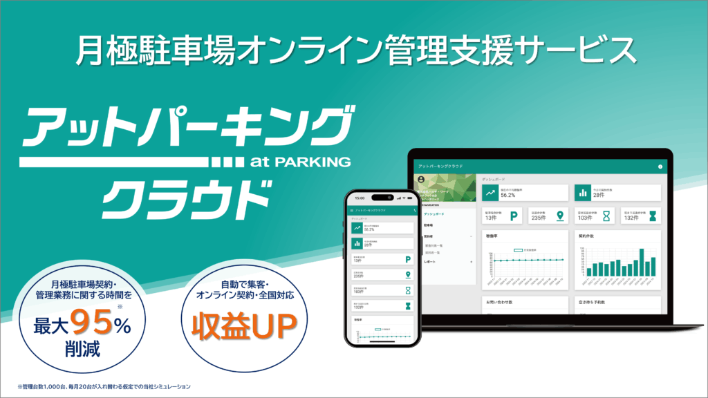 「アットパーキングクラウド」は月極駐車場の契約手続き、空き管理、顧客管理、請求業務などをオンラインで一元管理できるサービスです。また、システム提供に加え、月極駐車場の管理・運営の経験豊富なスタッフによる手厚いサポート体制も強みです。